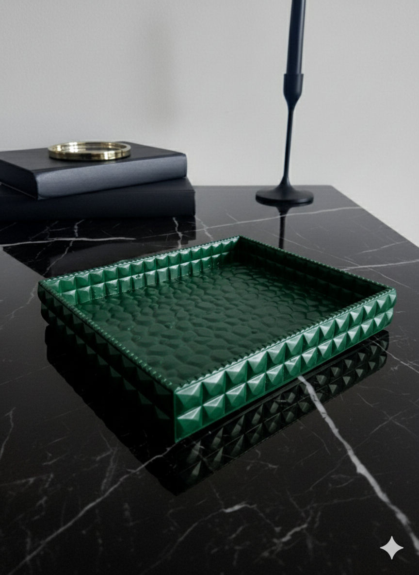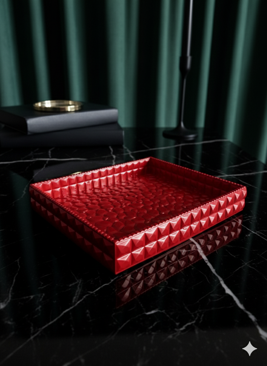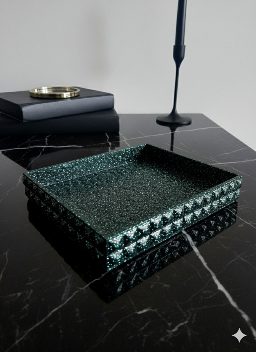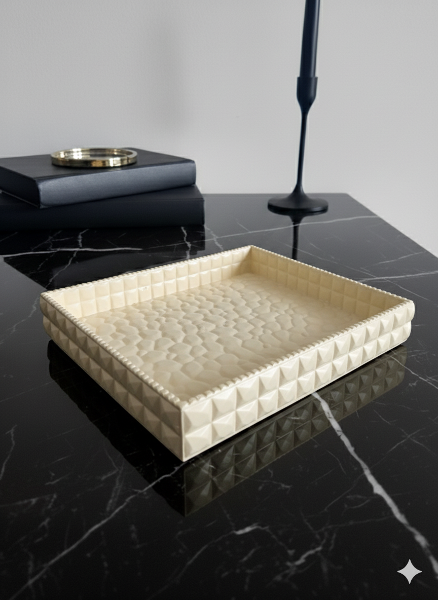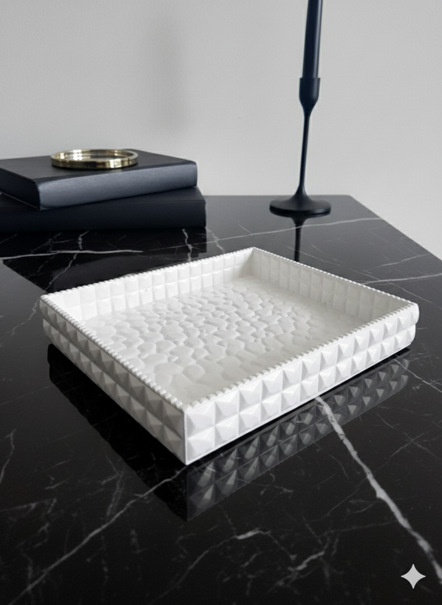 Pristatome „Piramidės Prabanga“ padėklą, kuris sujungia modernų dizainą ir funkcionalumą. Jo unikalus piramidžių ir iškilaus rašto dizainas sukuria įspūdingą tekstūrą, kuri pritraukia žvilgsnį ir suteikia prabangos bet kuriai erdvei. Puikiai tinka papuošalams, raktams ar kitoms smulkmenoms. Galima rinktis iš aukso, baltos, tamsiai žalios, dramblio kaulo, raudonos ir juodos spalvų, taip pat blizgančių variantų. Stilingas ir praktiškas pasirinkimas.