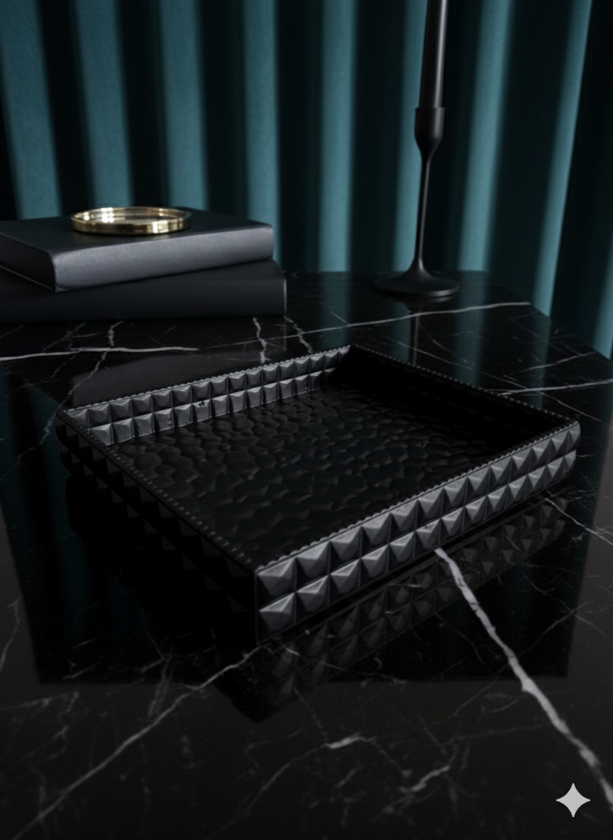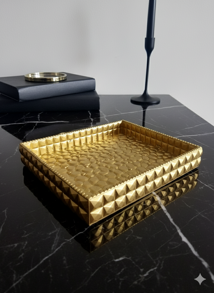 Funkcionalumas ir Universalumas: „Piramidės Prabanga“ padėklas yra ne tik gražus, bet ir praktiškas. Jis idealiai tinka papuošalams, laikrodžiams, raktams, monetoms, kosmetikos priemonėms ar tiesiog kaip elegantiška vieta kavos puodeliui. Padėklas puikiai tinka svetainės stalui, prieškambario konsolei, miegamojo naktiniam staliukui ar biuro darbo vietai. Ant tamsaus marmurinio stalo, kartu su minimalistinėmis žvakidėmis ar knygomis, jis sukurs išbaigtą ir stilingą kompoziciją.
